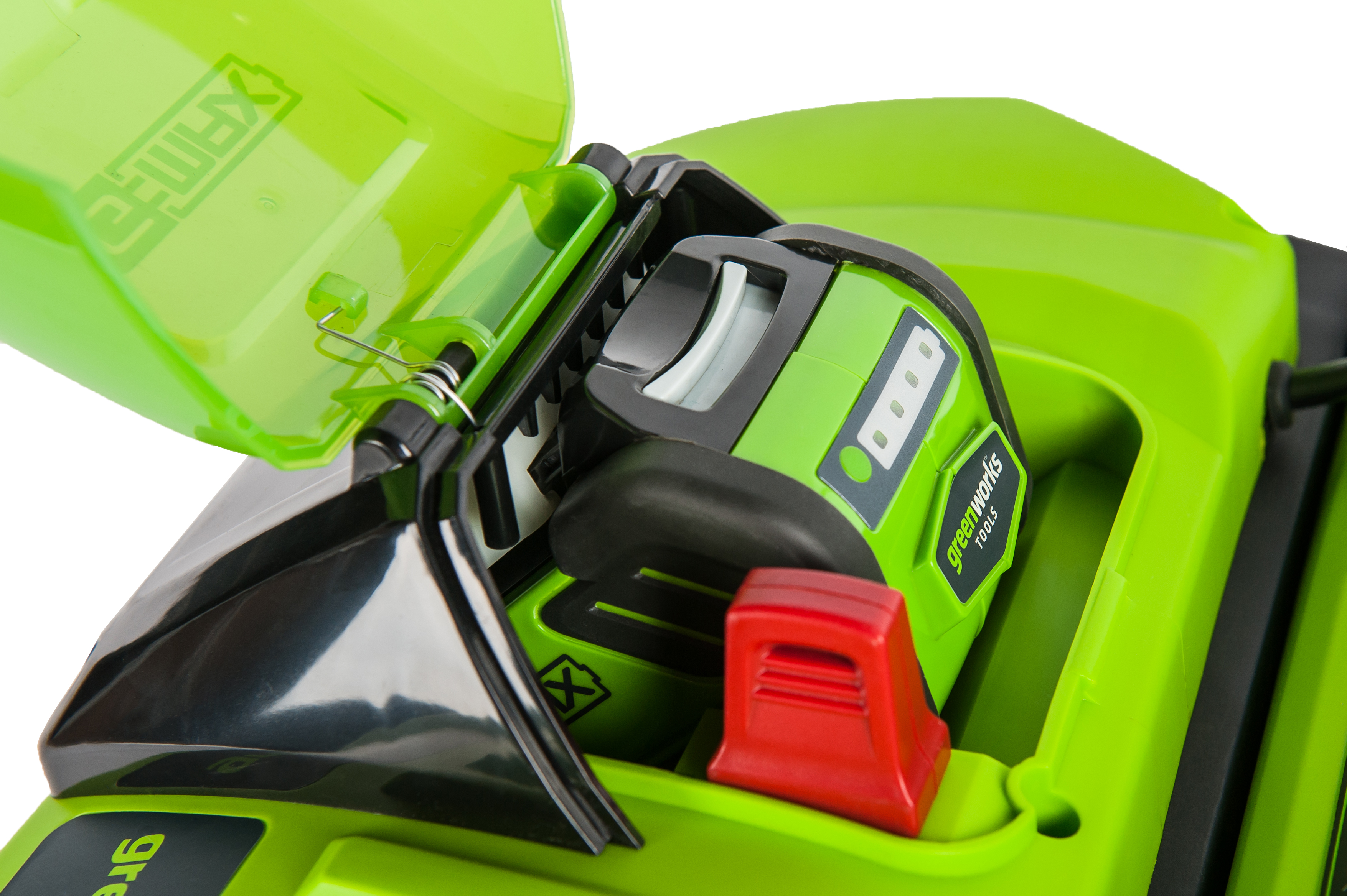 Для удобства и компактного хранения ручка аэратора складывается. Для безопасности данная модель оснащена предохранителем от случайного включения. Аэратор работает от аккумуляторной батареи G-MAX 40V, которую можно использовать с другими с устройствами из линейки 40 вольтовой техники Greenworks.