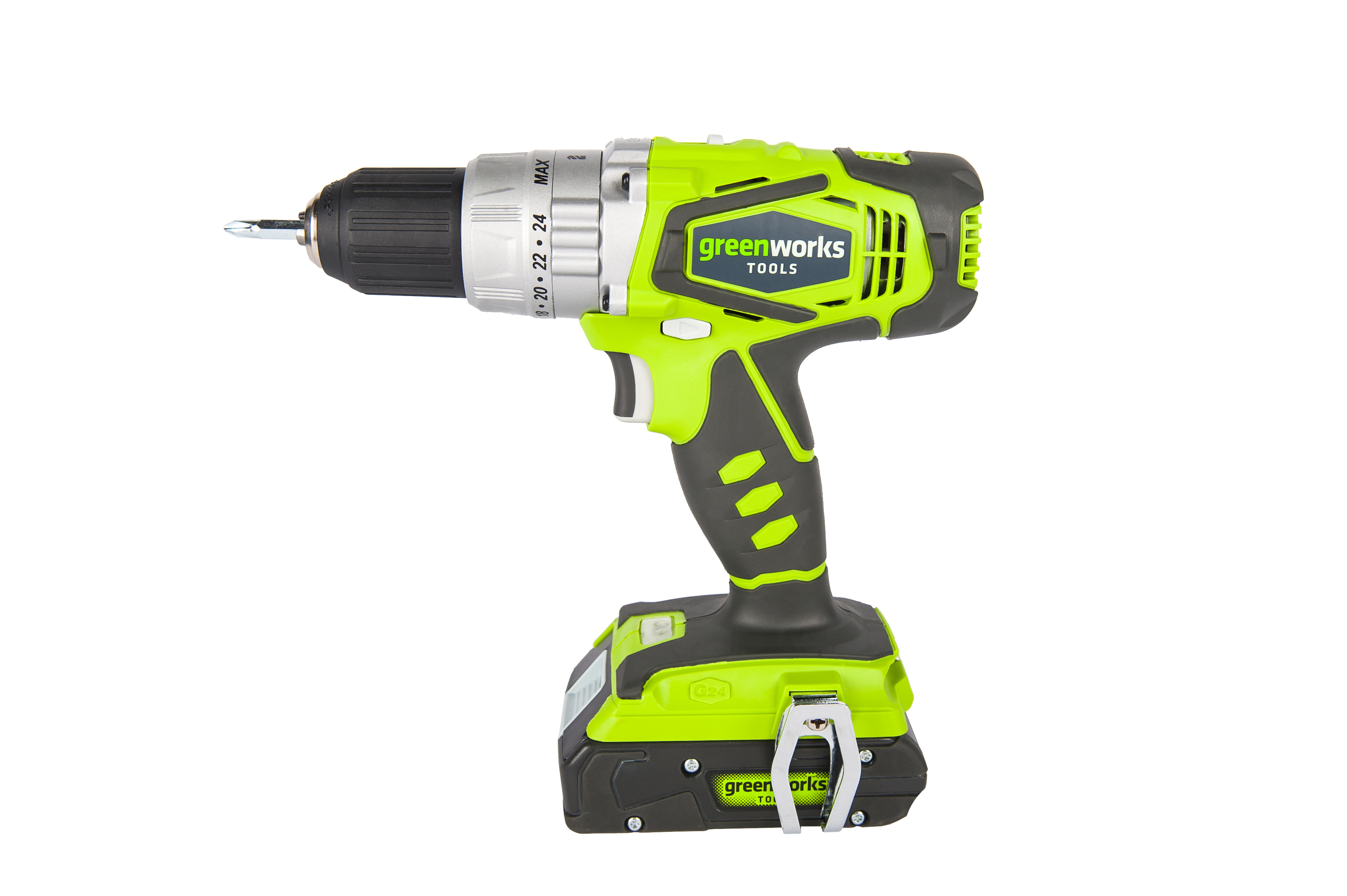 Дрель работает от аккумулятора 24 В, что на 33% мощнее обычного 18-ти вольтового стандарта на рынке дрелей. Важным плюсом этого аккумулятора является то, что он совместим с более 20 устройствами линейки Greenworks G-24 24V.