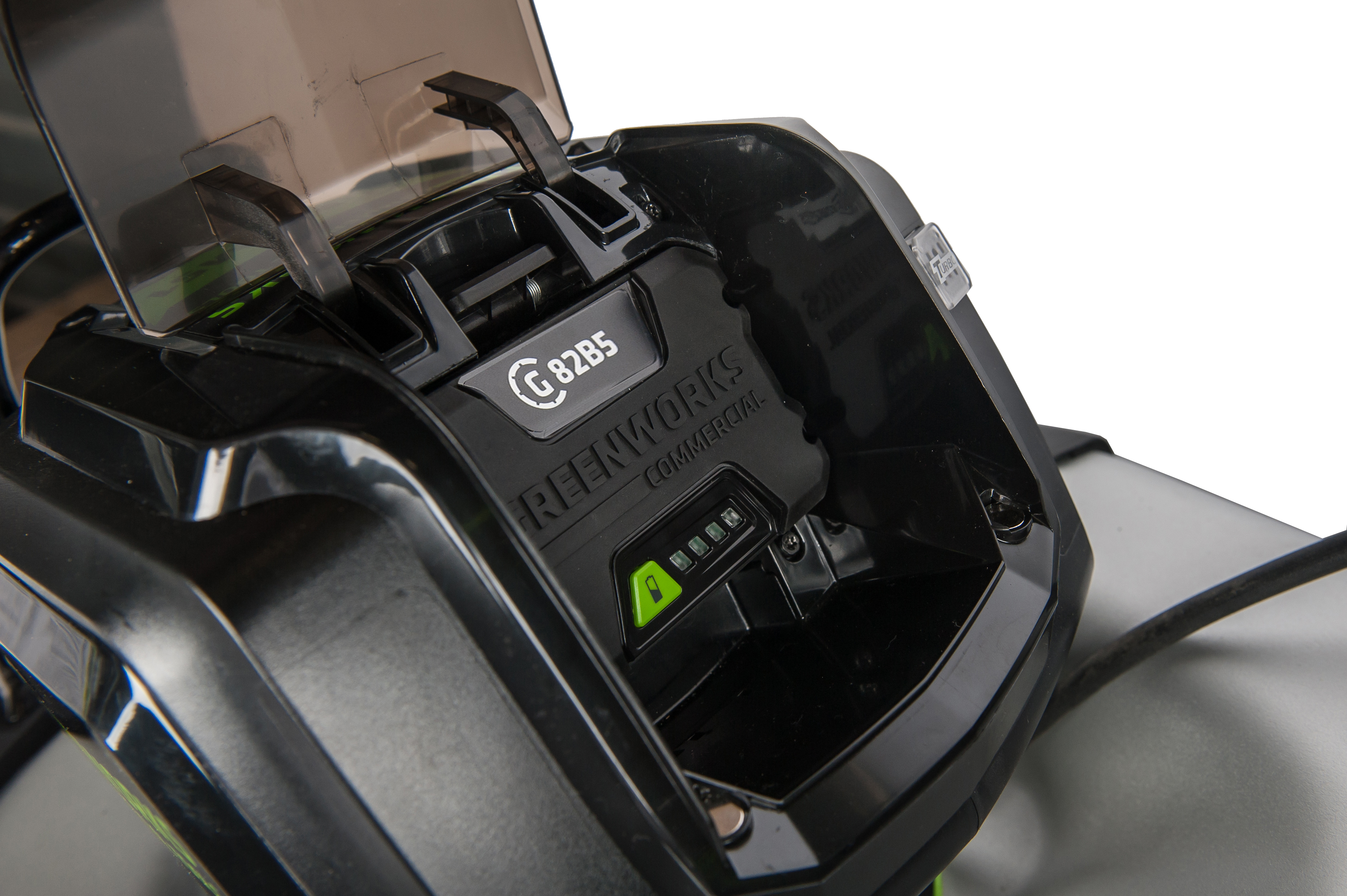 Газонокосилка работает от аккумуляторной батареи 82V Commercial, которую можно использовать другими с устройствами линейки 82V.