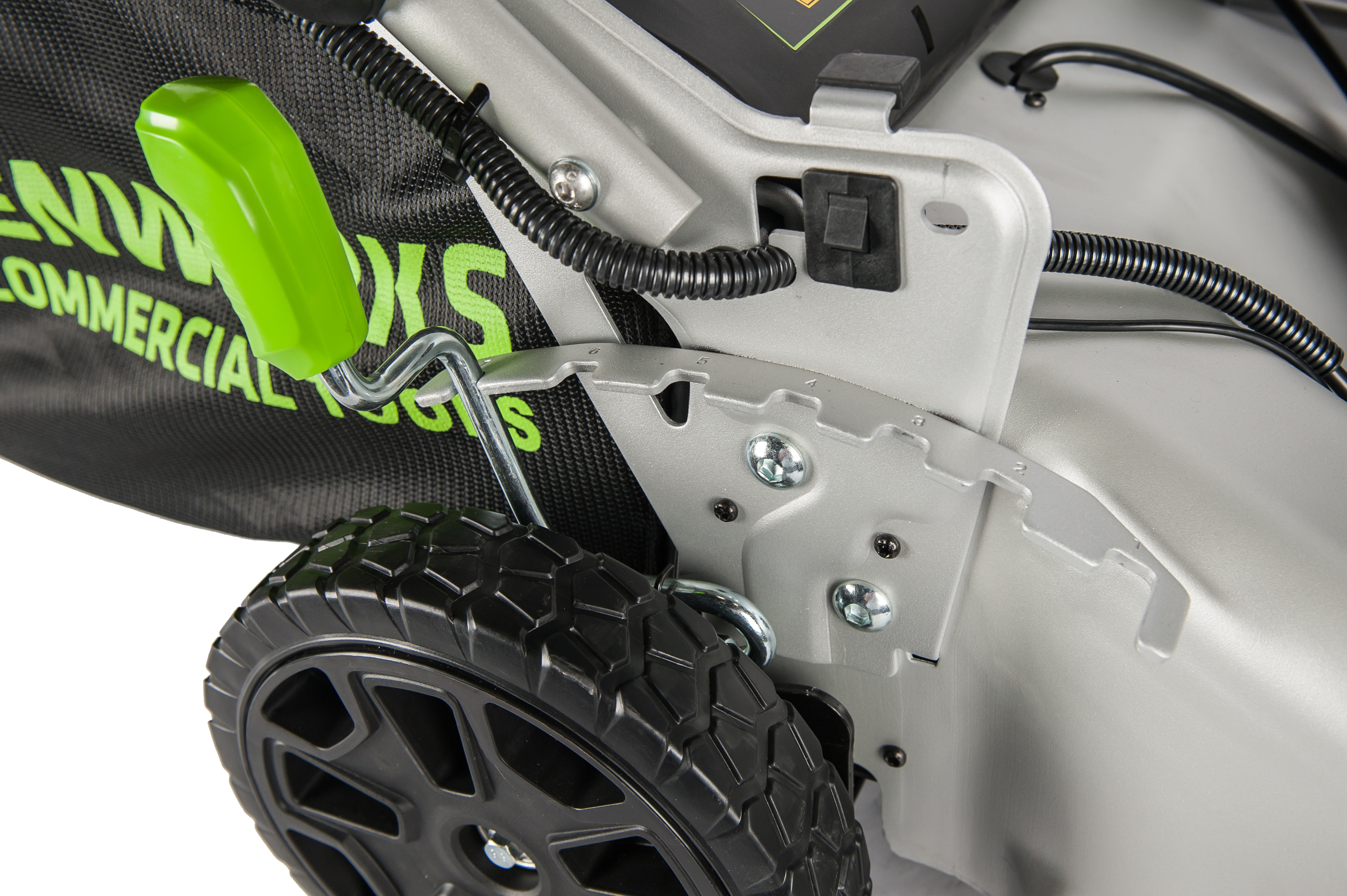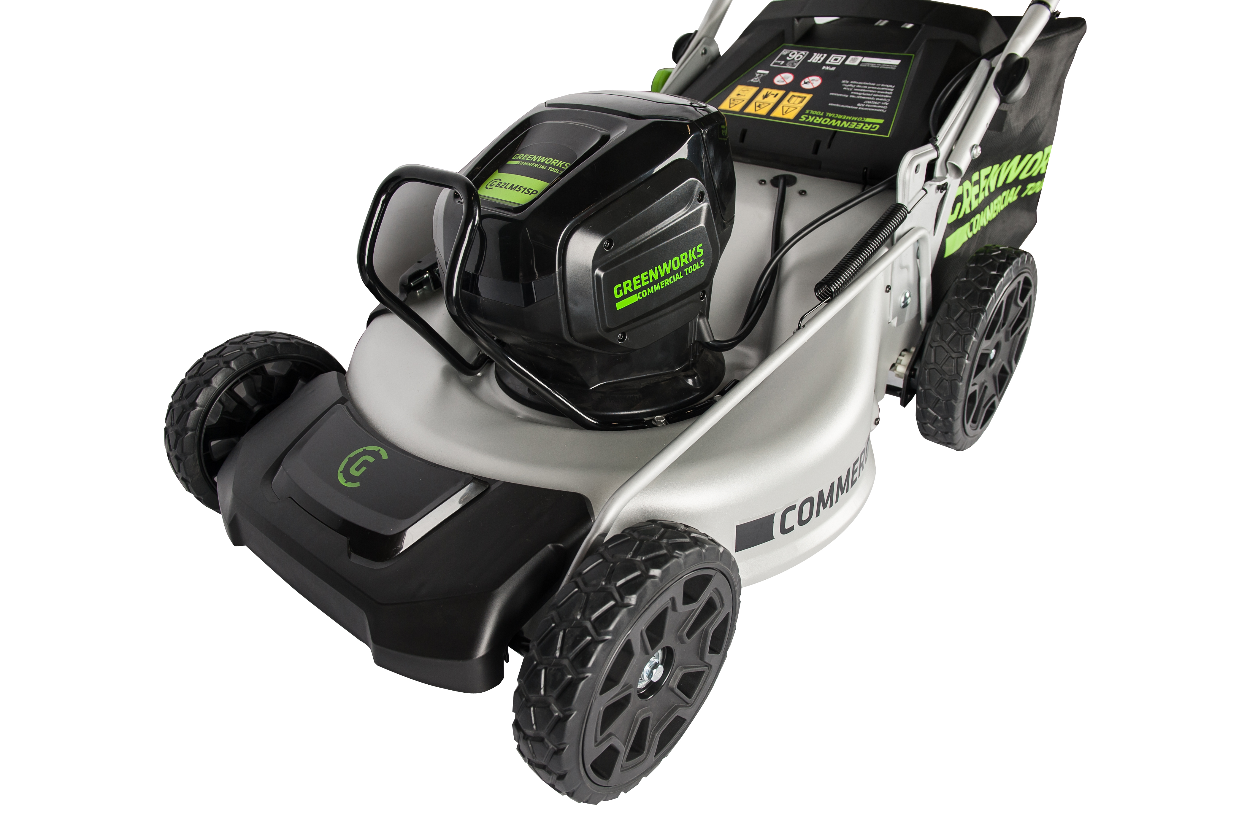 Травосборник на 50 литров имеет гибридное строение - металлический каркас и мягкий мешок для удобства хранения. Для защиты двигателя от механических повреждений, например при наезде на камень, предусмотрен предохранитель между лезвием и приводом двигателя. Для защиты от случайного включения предусмотрен специальный ключ безопасности и кнопка-предохранитель. Ручка газонокосилки складывается. Газонокосилка работает от аккумуляторной батареи 82V Commercial, которую можно использовать другими с устройствами линейки 82V.