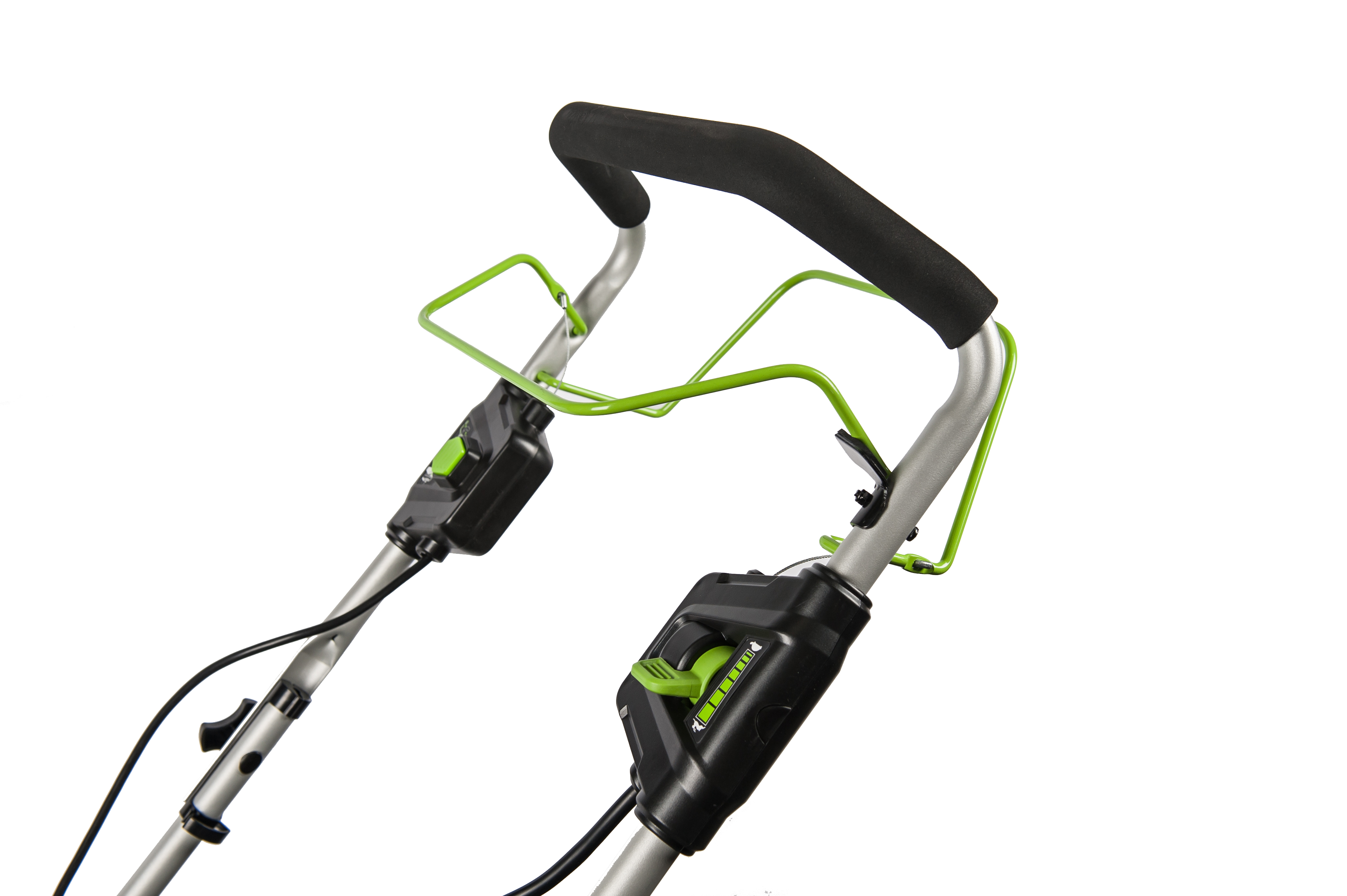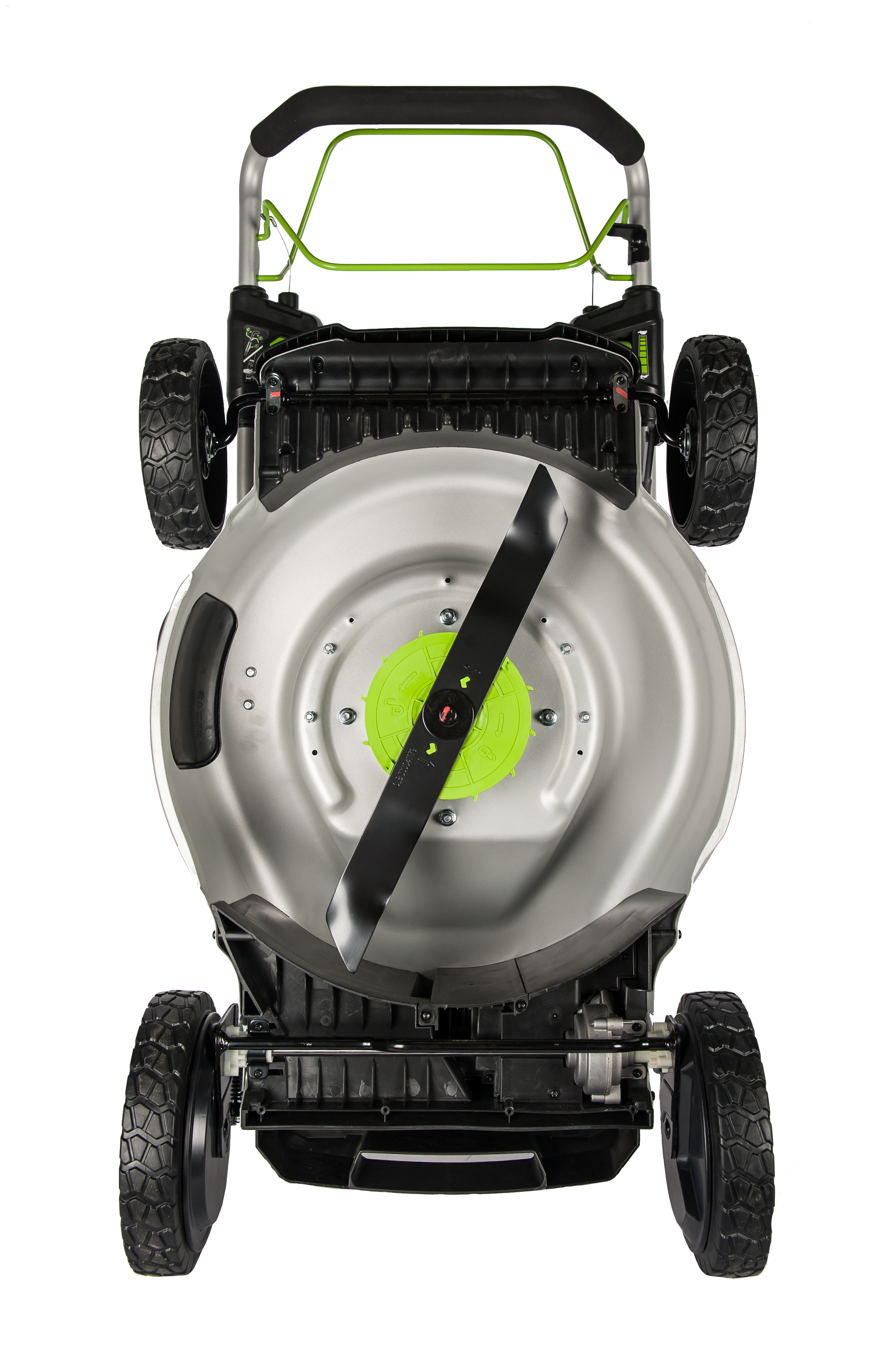 Двигатель оснащается технологией автоматической регулировки оборотов ECO-Boost - для экономии заряда батареи, а также оснащается кнопкой с принудительным Turbo-режимом. Ширина скашивания составляет внушительные 51 см. Дека газонокосилки выполнена из стали, а корпус двигателя из АБС пластика защищен специальной дугой, которая в то же время является ручкой для переноски газонокосилки. Регулировка высоты скашивания имеет 7 положений: от 25 мм до 80, механизм регулировки металлический на все 4 колеса и имеет пружину для облегчения поднятия уровня скашивания.