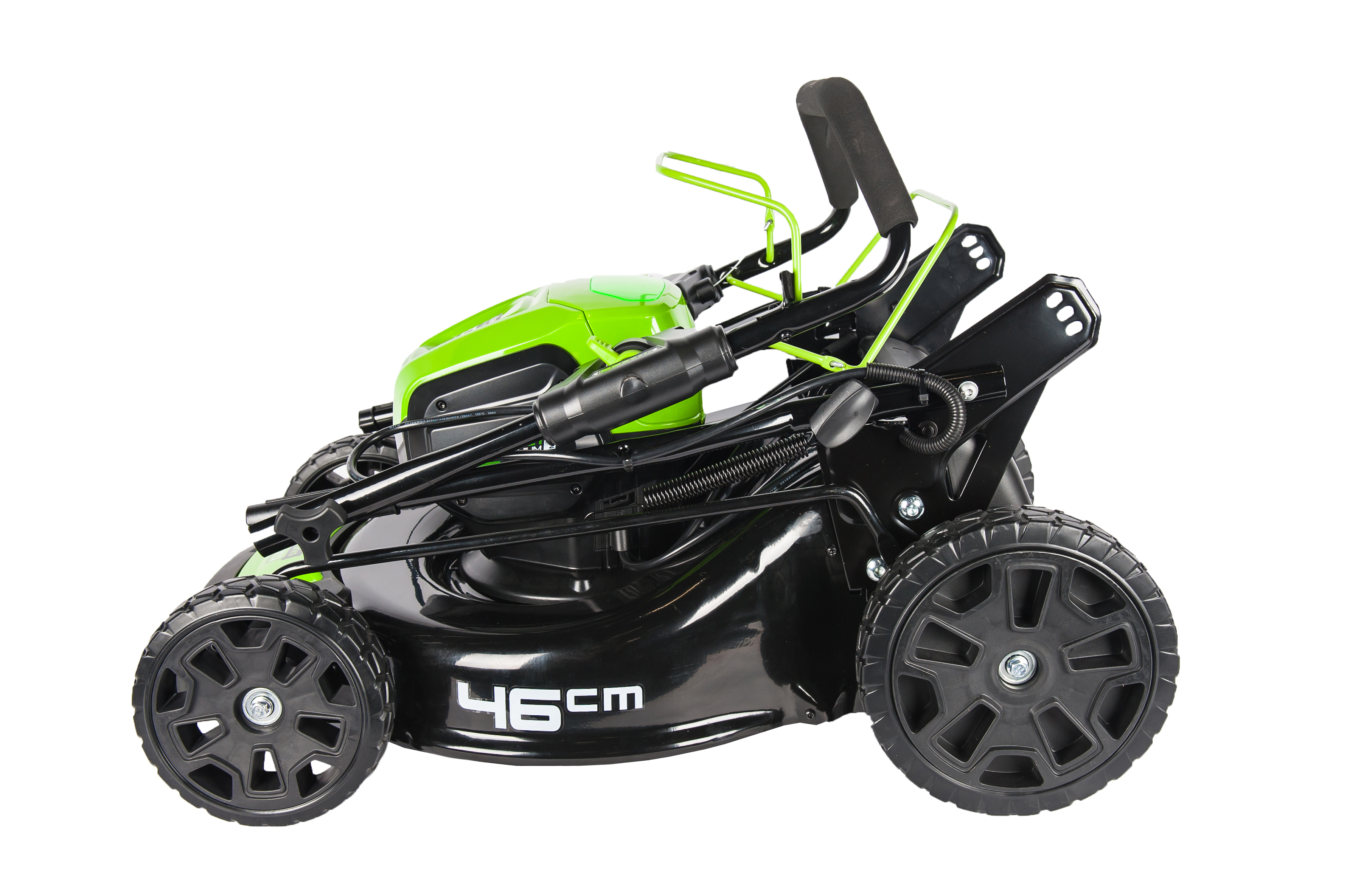 Газонокосилка имеет ширину скашивания 46 см, обладает функцией мульчирования, сбора травы в травосборник, а также боковой выброс травы. Травосборник объемом 50 литров и имеет металлический каркас с индикатором наполнения.