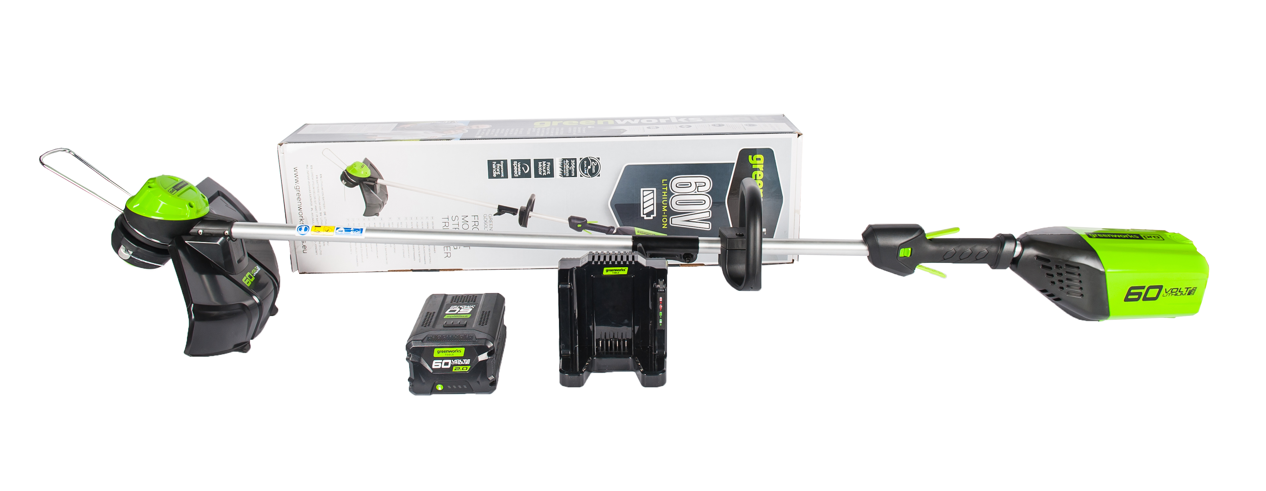 Триммер оснащается современным индукционным или бесщеточный двигателем DigiPro™, который не уступает в своих характеристиках бензиновому двигателю, но не загрязняет окружающую среду выхлопами СО, имеет повышенный крутящий момент, низкий уровень шума и вибрации. Важным преимуществом электрического двигателя является его простота эксплуатация. Вам не нужно его заводить, включение происходит нажатием одной кнопки. Он прост в обслуживании, ему не нужно менять фильтры или масло, свечи. Нет необходимости смешивать бензин с моторным маслом. А в сравнение со стандартным щеточным двигателем, бесщеточный двигатель до 10 раз надежнее. Для долговечной службы двигатель оснащается системой защиты от перегрузок. Вал от двигателя до катушки - прямой и сделан из стали, что также увеличивает срок службы триммера по сравнению с тросовой конструкцией. В комплекте с триммером поставляется зарядное устройство и аккумулятор 2 Ач 60V, который применяется и совместим со всеми устройствами из линейки Greenworks 60V.