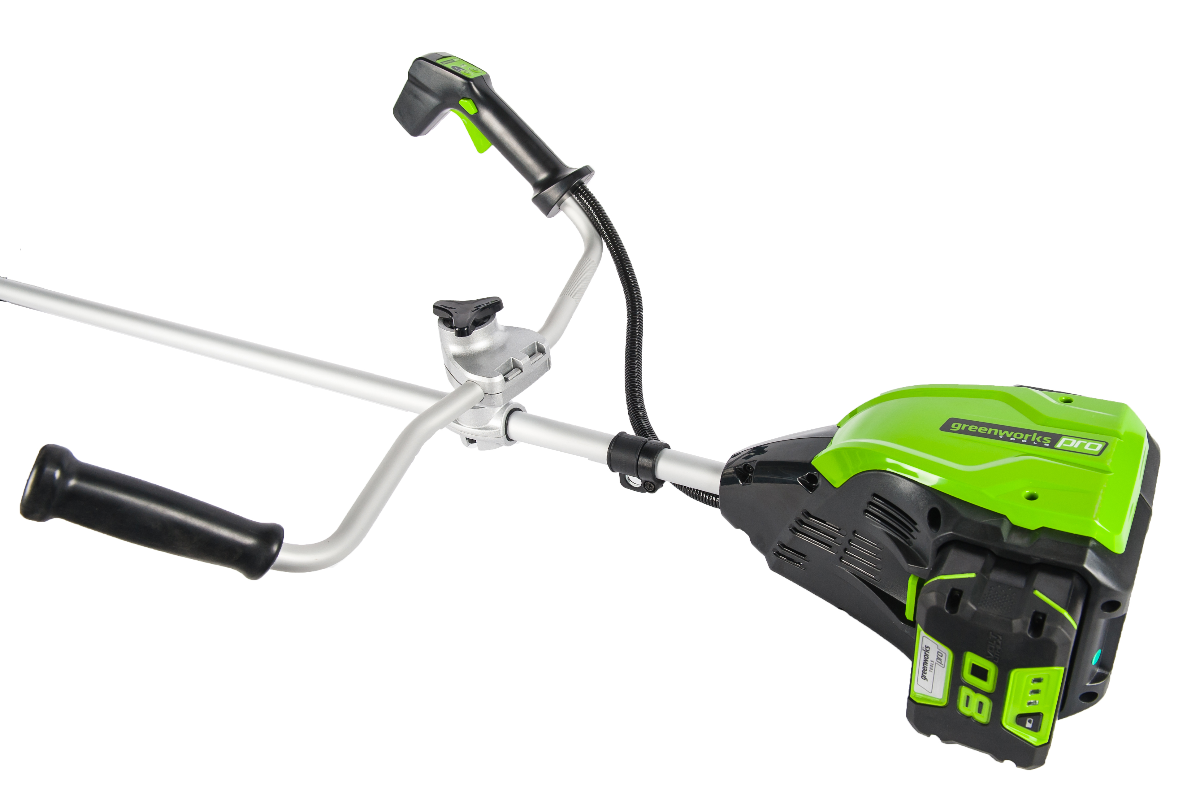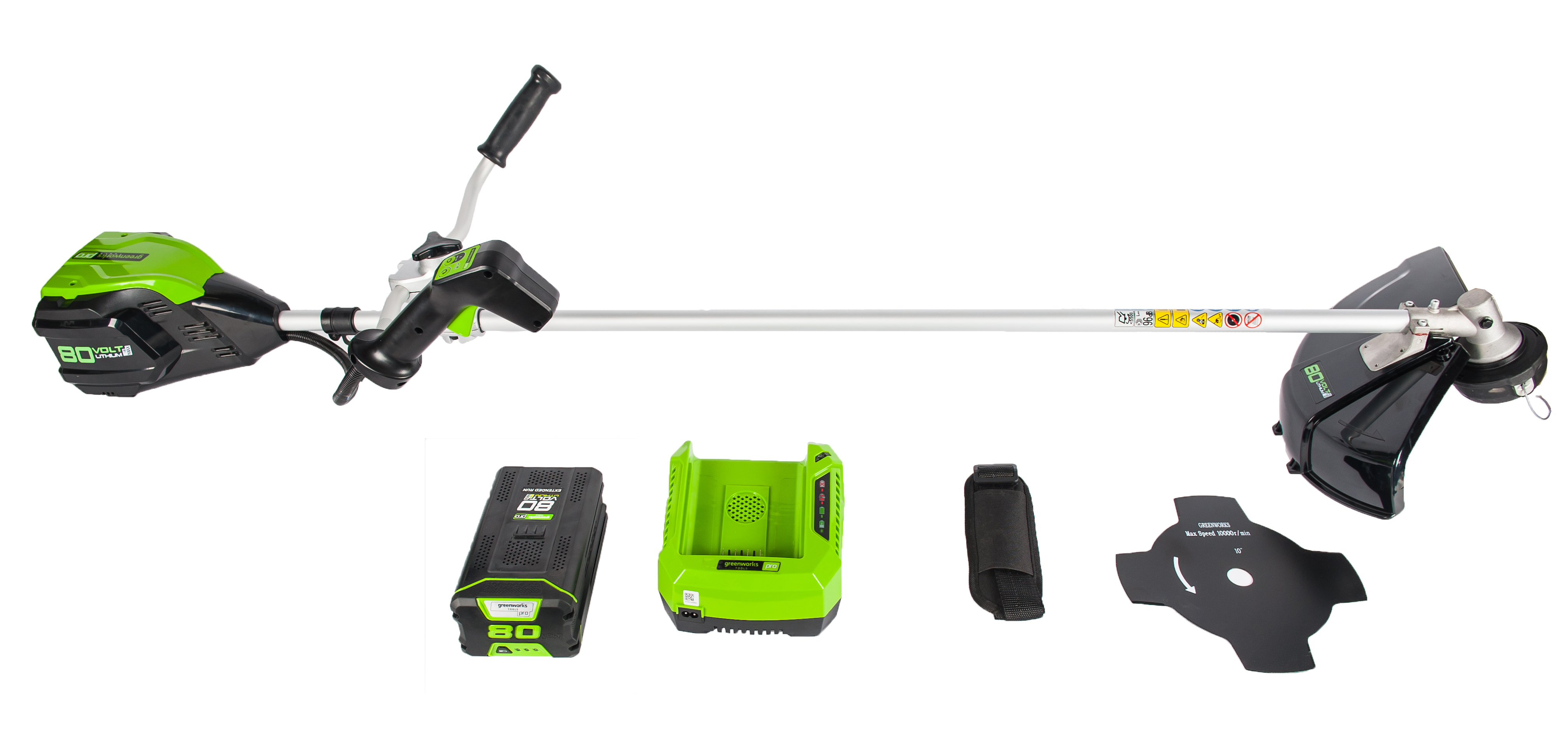 Триммер работает от аккумуляторной батареи 80V PRO, которую можно использовать со всеми устройствами GreenWorks из линейки техники 80 вольт.