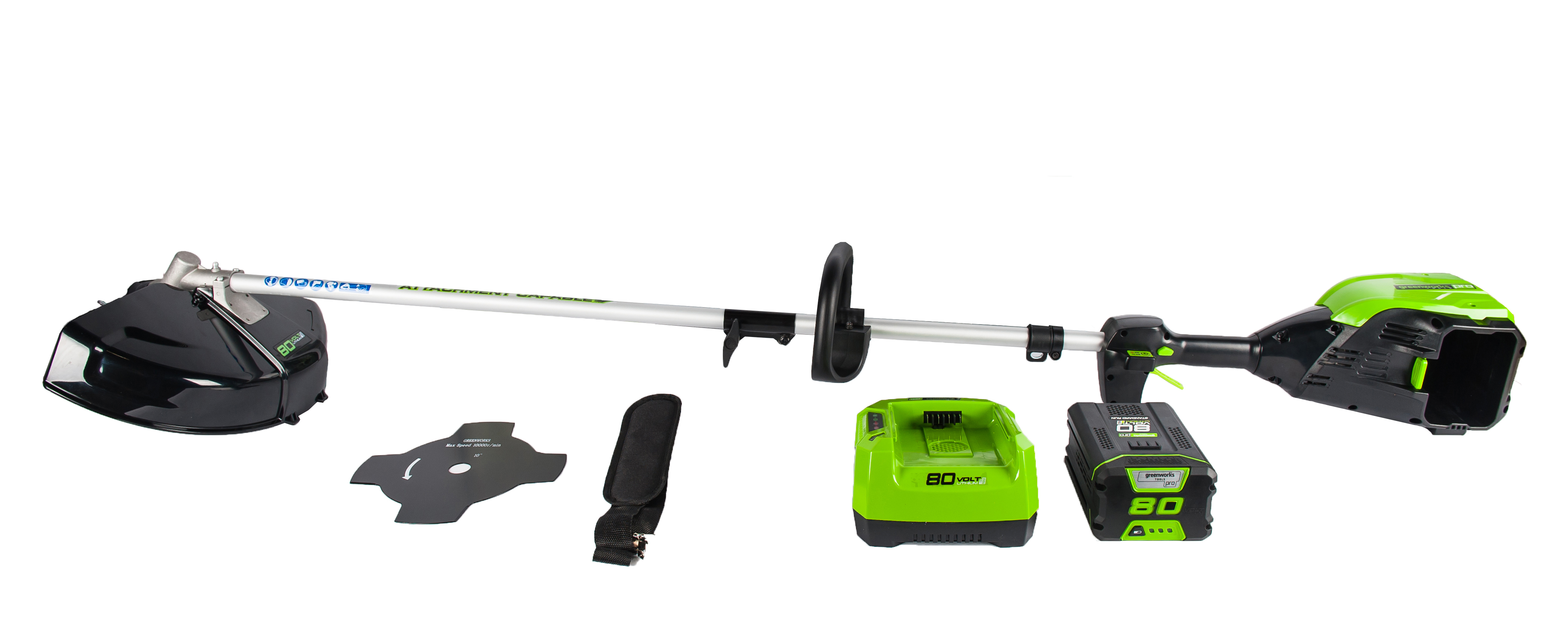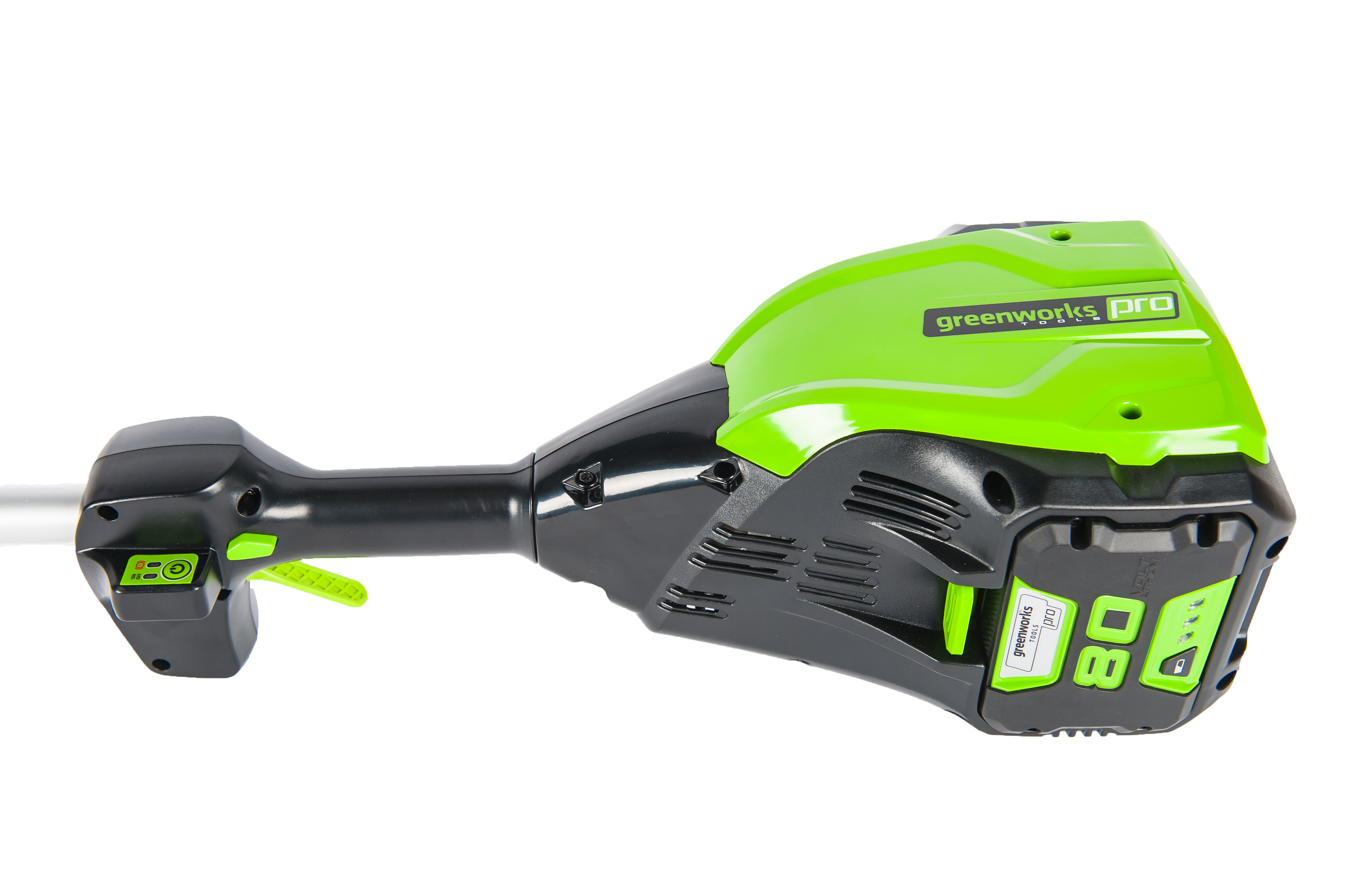 Триммер работает от аккумуляторной батареи 80V PRO, которую можно использовать со всеми устройствами GreenWorks из линейки техники 80 вольт.