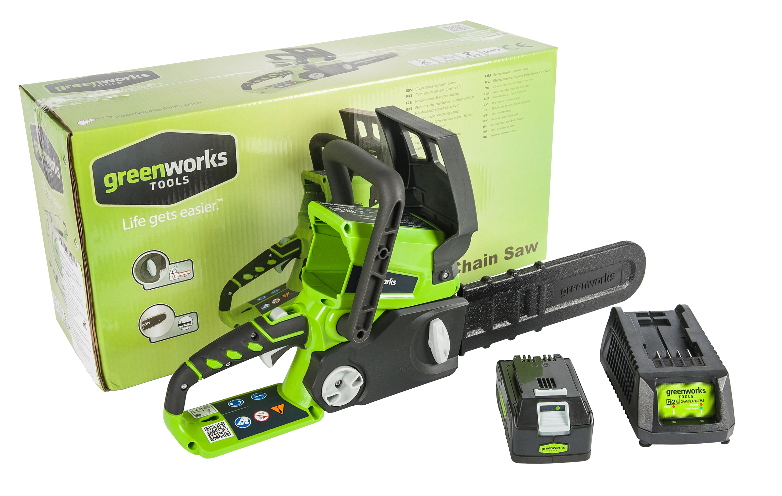 Комплект, состоящий из цепной аккумуляторной пилы GreenWorks 24 вольт (модель G24CS25), АКБ батареи 2 А⋅ч и зарядного устройства. Вес пилы без аккумулятора составляет всего 2,7 кг.