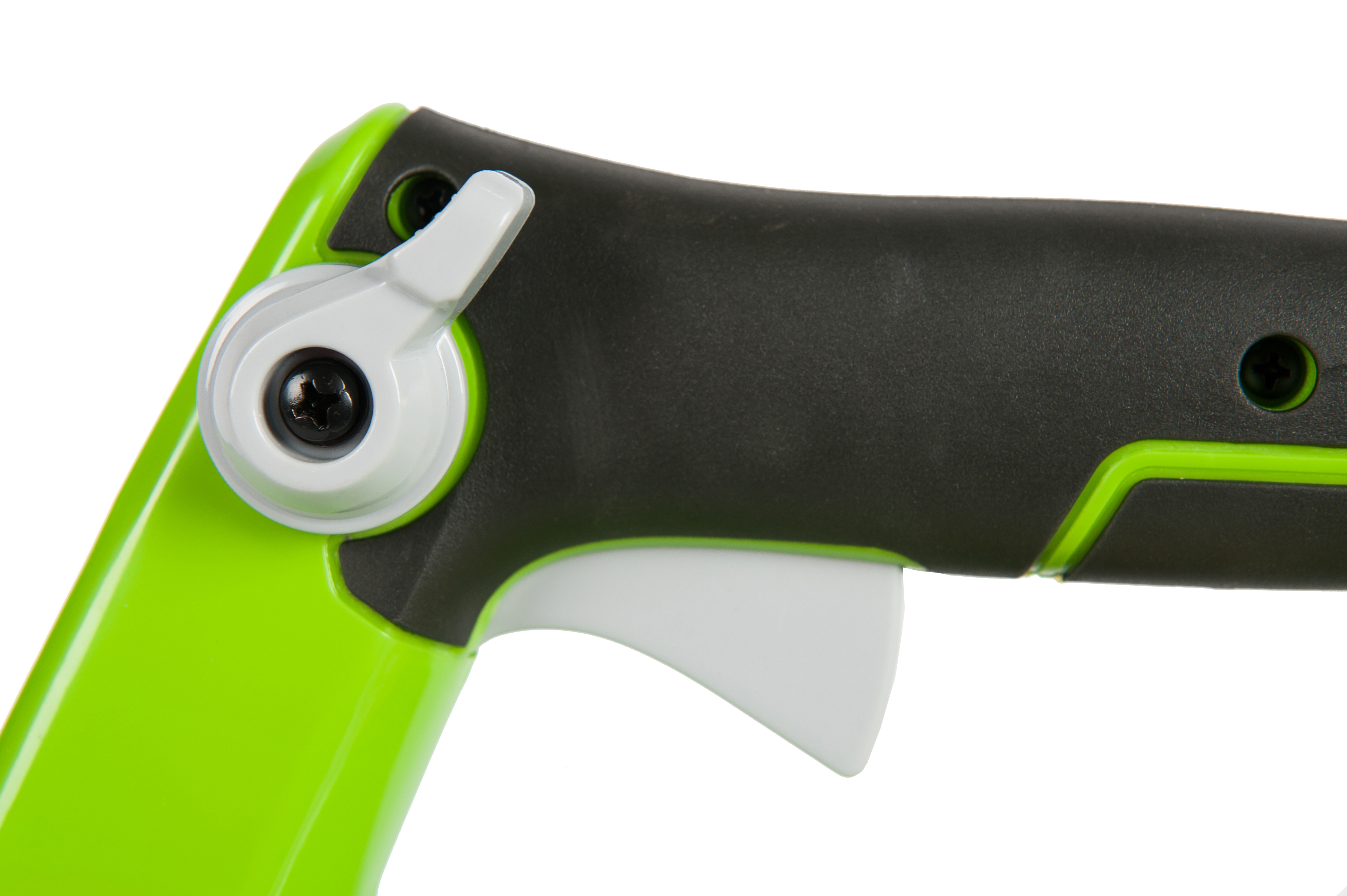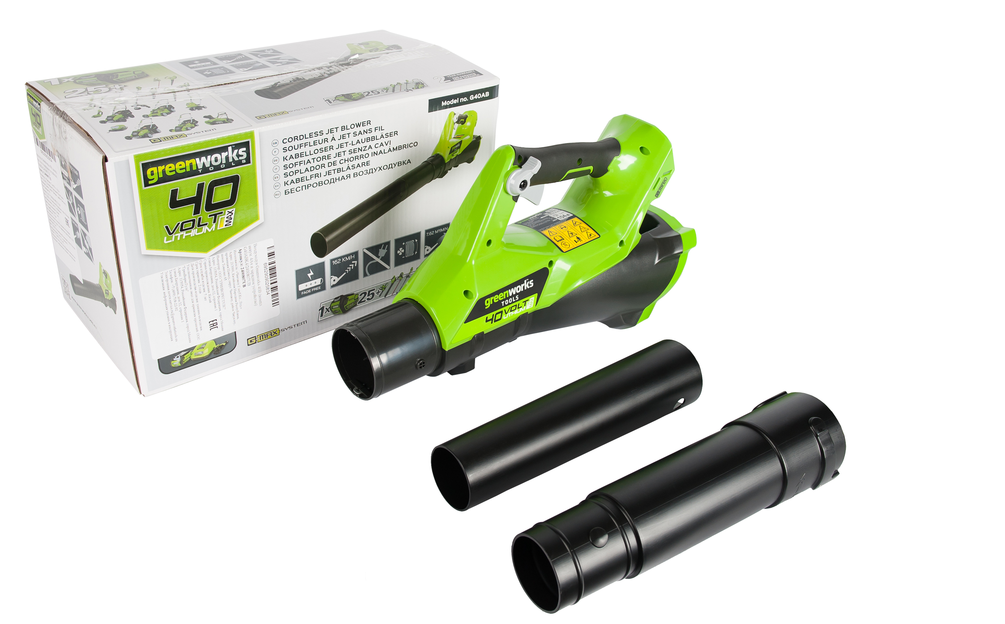 Воздуходув работает от аккумуляторной батареи G-MAX 40V (2 А/Ч или 4 А/ч, в комплект не входят), которую можно использовать с другими устройствами из линейки устройств GreenWorks 40V.